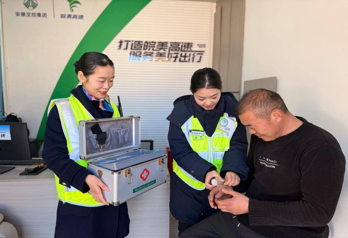 黄山中心黄山南门站职工为受伤司乘提供简便医疗。安徽交控集团黄山顾问中心供图
