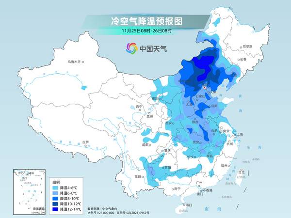 今天起寒潮大举南下,降温影响干与主力时段。中央征象台瞻望,11月25日至28日,我国中东部大部地区气温将先后着落6至10℃,其中,华北北部、内蒙古中部及东北地区等地部分地区降温12至14℃,局地16℃以上。今晨,中央征象台连续发布寒潮黄色预警。