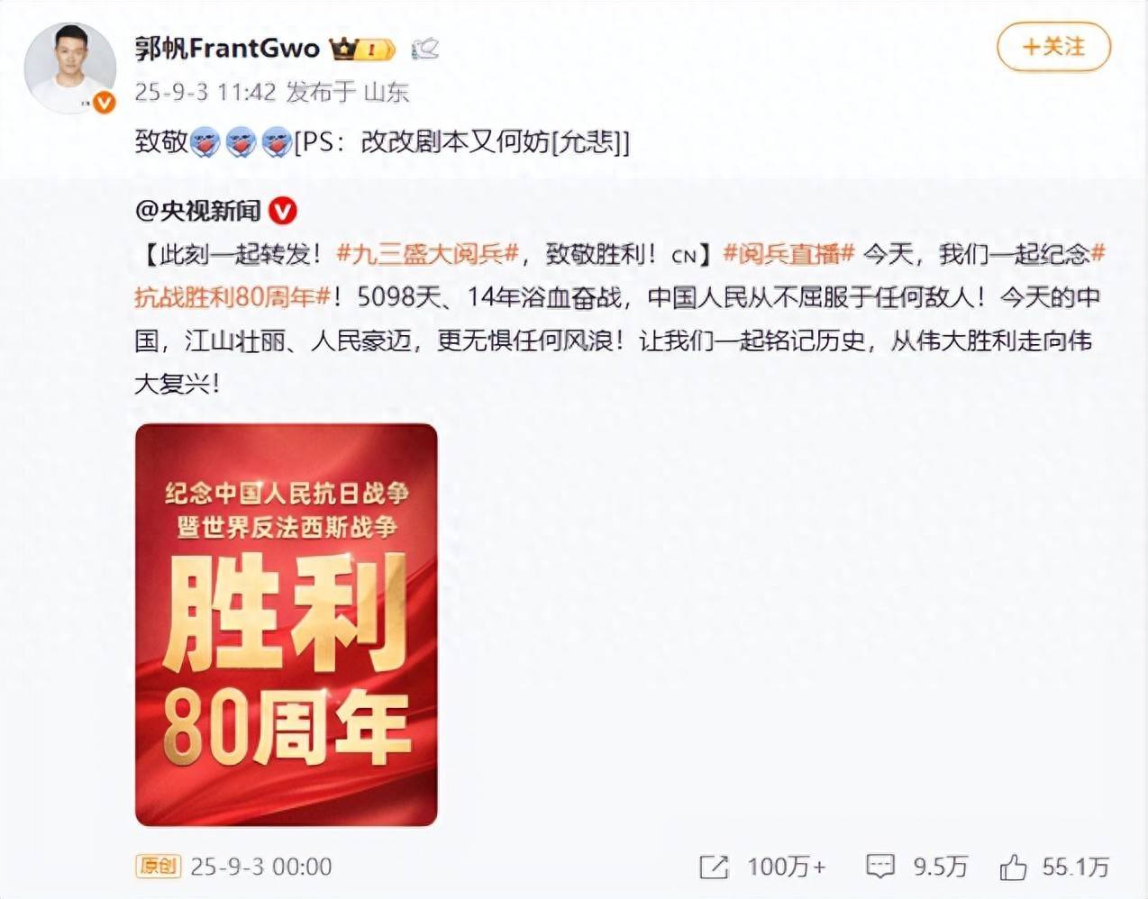 9月3日是中国东说念主民抗日交游暨寰宇反法西斯交游得胜80周年挂牵日。在九三巨大校阅盛典截止后,网友在郭帆的酬酢平台留言喊话“导演快改脚本”“原本《流浪地球3》是记载片”“《流浪地球3》再不改脚本就要酿成古装片了”。