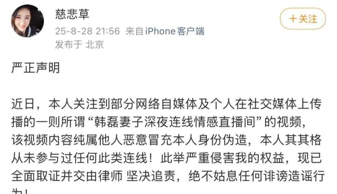 昨日稍早工夫,韩磊太太其其格在微博发布严正声明称,“近日,本东谈主神志到部分集合自媒体及个东谈主在酬酢媒体上传播的一则所谓‘韩磊太太深夜连线厚谊直播间’的视频,该视频实质熟悉他东谈主坏心冒充本东谈主身份伪造,本东谈主其其格从未参与过任何此类连线!此举严重侵害我的权力,现已全面取证并交由讼师强硬追责,毫不姑息任何捏造辩驳行径! ”