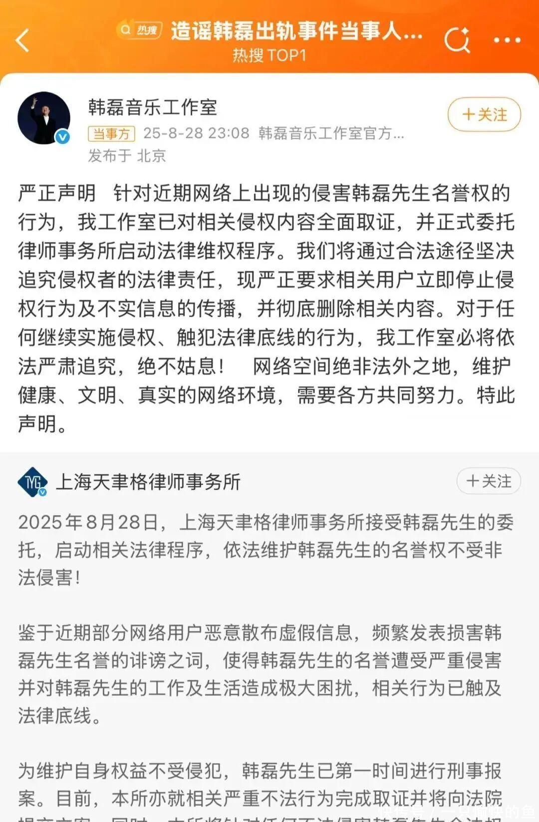 昨日23时许,韩磊音乐师作室发布严正声明,称针对近期集合上出现的侵害韩磊先生名誉权的行径,使命室已春联系侵权实质全面取证,并寂静拜托讼师事务所运行法律维朱门径。