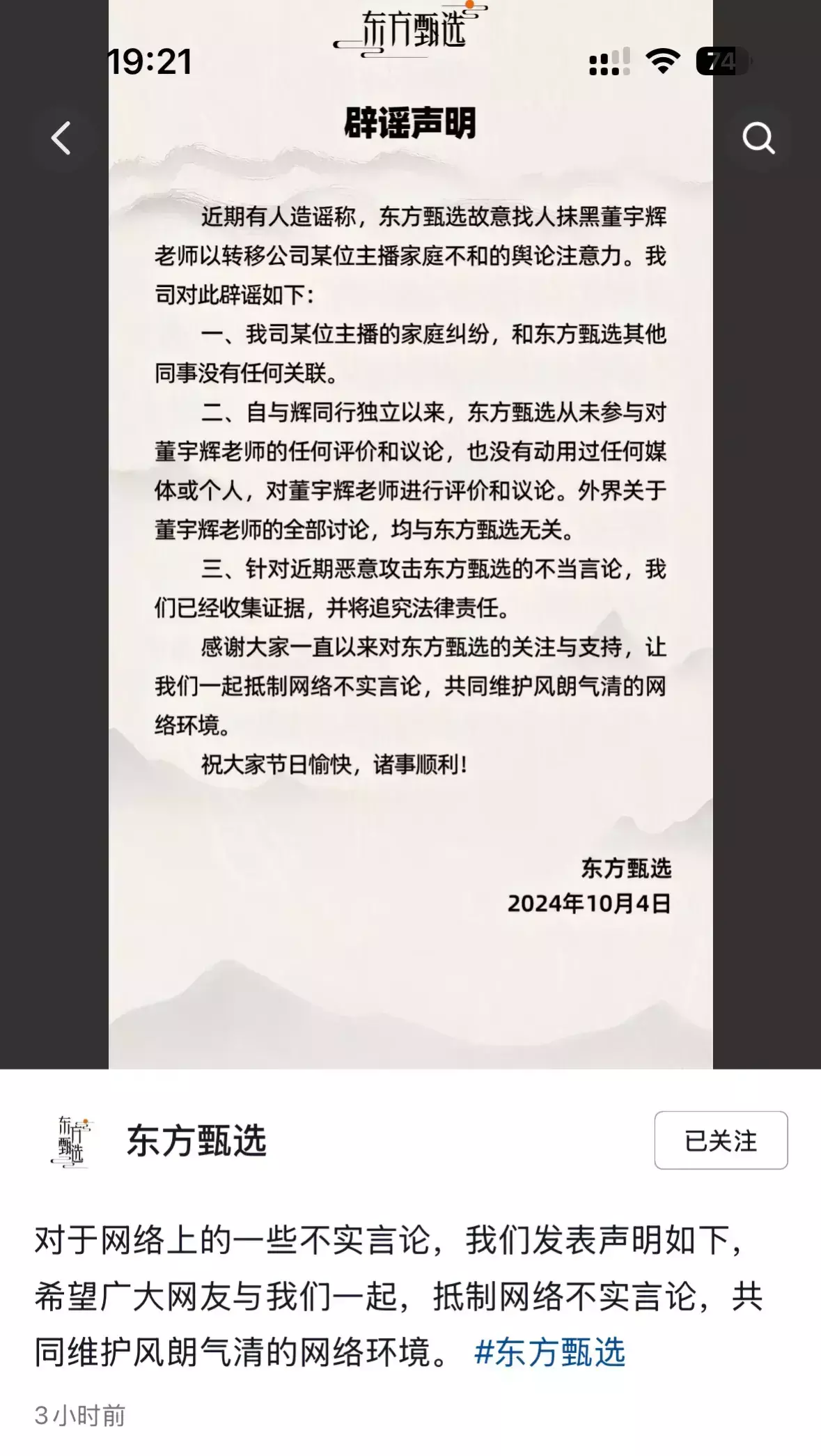 10月4日下昼3点半,东方甄选针对荟萃上的一些作假言论发布辟谣声明,并号召宽广网友一齐按捺作假言论。