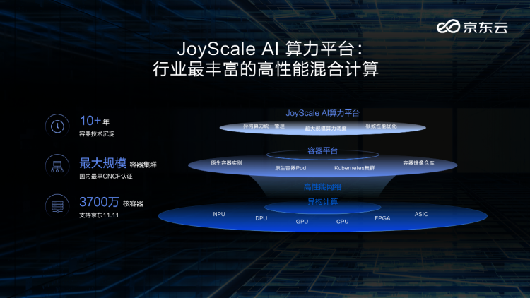 面向AI算力需求,京东云看成行业里最早大范围部署混划算力的云厂商,领有超3700万个核容器集群,历经“618”“双11”“春晚”等极限场景锻练,诞生起行业进步的混划算力时间储备。这些上风在京东云JoyScale AI算力平台中充分体现:平台不仅与华为昇腾、海光、寒武纪等国产芯片深度相连,而况完结从内核层调和补救英伟达及国产芯片,为企业提供高效自主的算力照拂。
