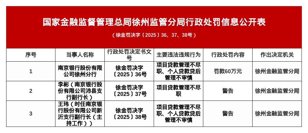 针对上述犯警违法行径开yun体育网,国度金融监督措置总局徐州监管分局对其罚金60万元;对南京银行股份有限公司沛县支行副行长李彬申饬;对南京银行股份有限公司新沂支行副行长(主握责任)王玮申饬。
