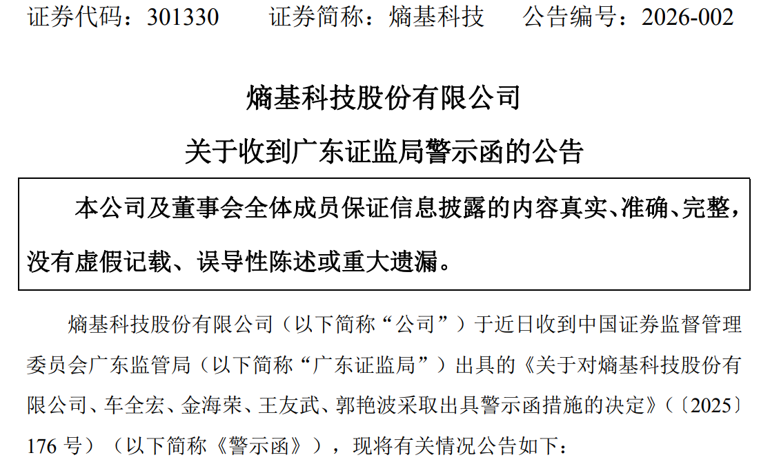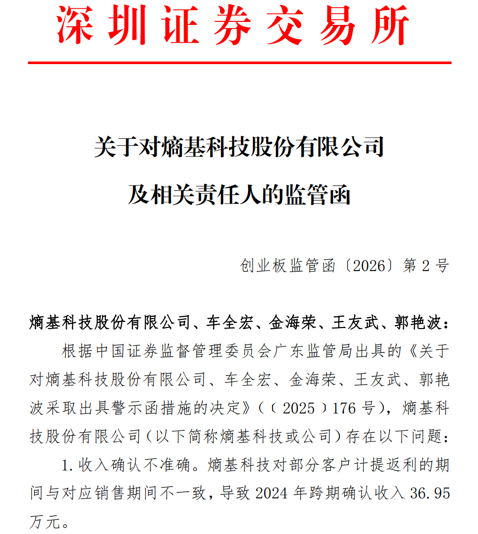 因为上述违纪问题,1月9日,熵基科技及关连包袱东谈主还收到深交所监管函。